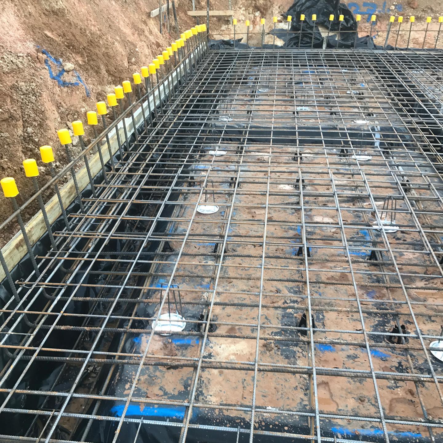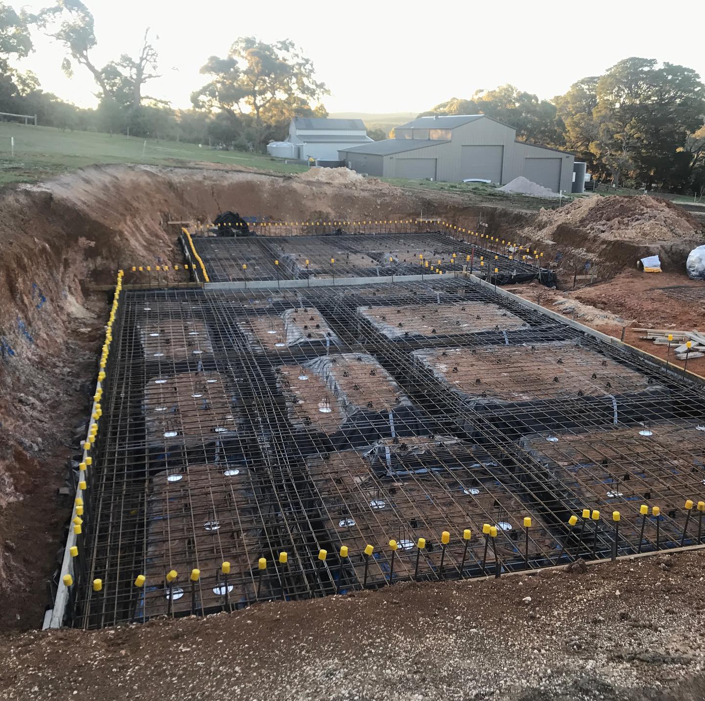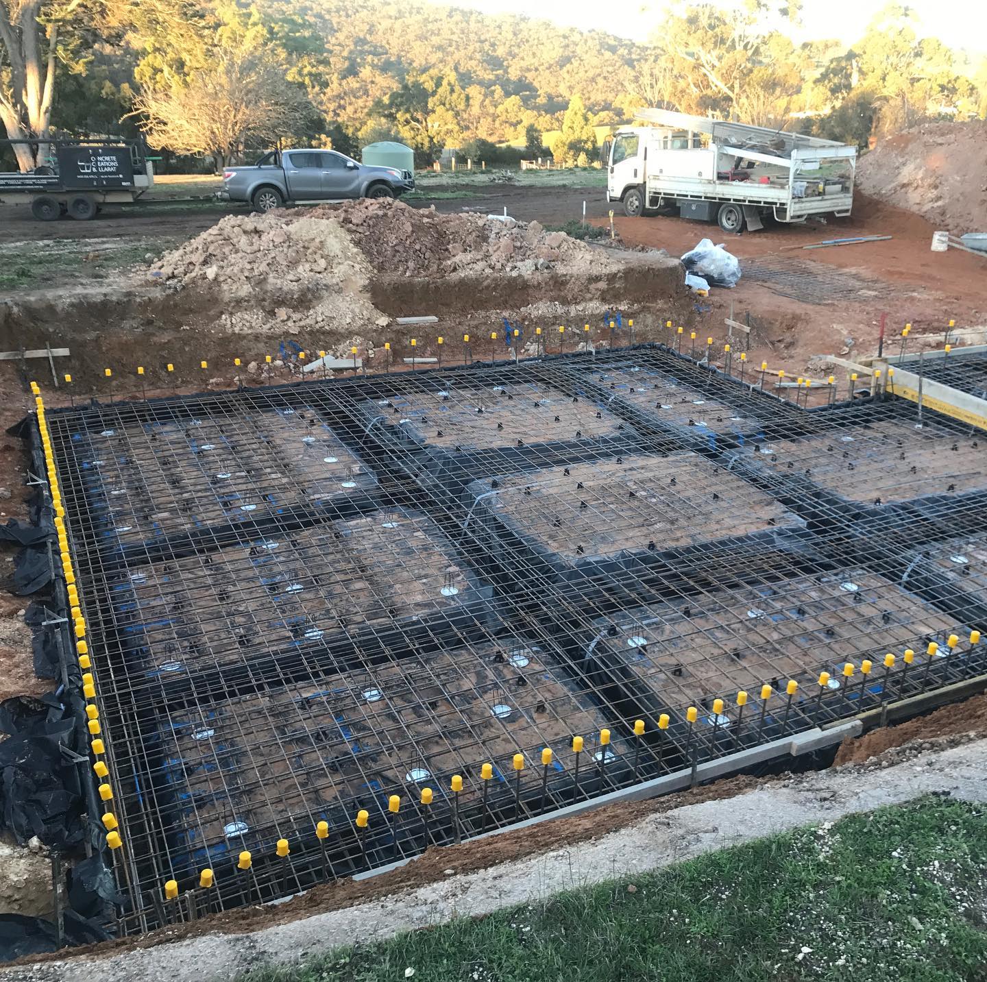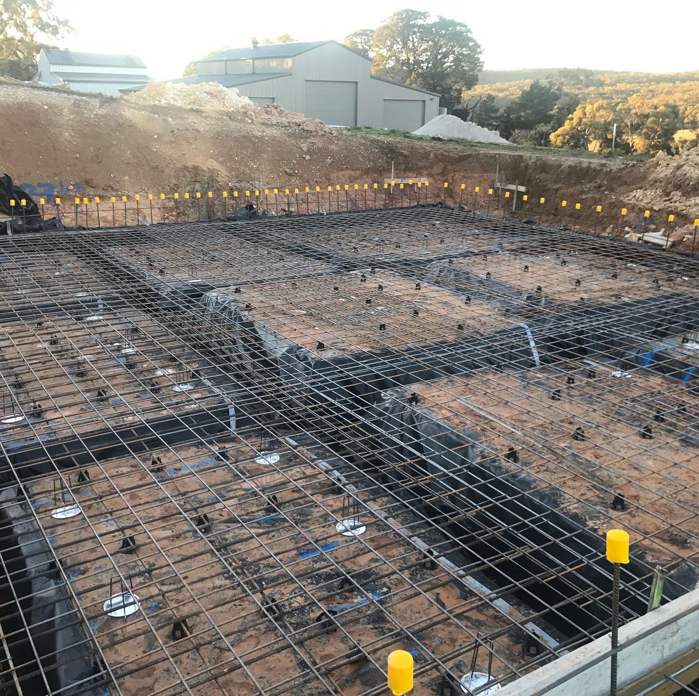 Basement and garage slab at our Linton project. 250mm deep by 2.5m wide thickening around the entire slab, top layer SL102 and bottom layer 16mm bar 200mm centres perpendicular to slab edge with cranked Ls and 12mm bar at 400mm centres parallel to slab. A lot of steel to keep on top of but the boys smashed it and have produce a nice neat job.